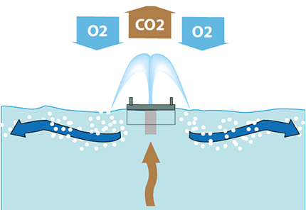 L’oxygène de l’air est transféré dans l’eau. Le bassin d’eau est ainsi aéré.